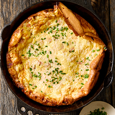 - Bake. Transfer skillet to the oven and bake 15-25 minutes or until pancake is puffy and golden brown. Top with grated Parmesan cheese and chopped chives. Cut into quarters and serve immediately.